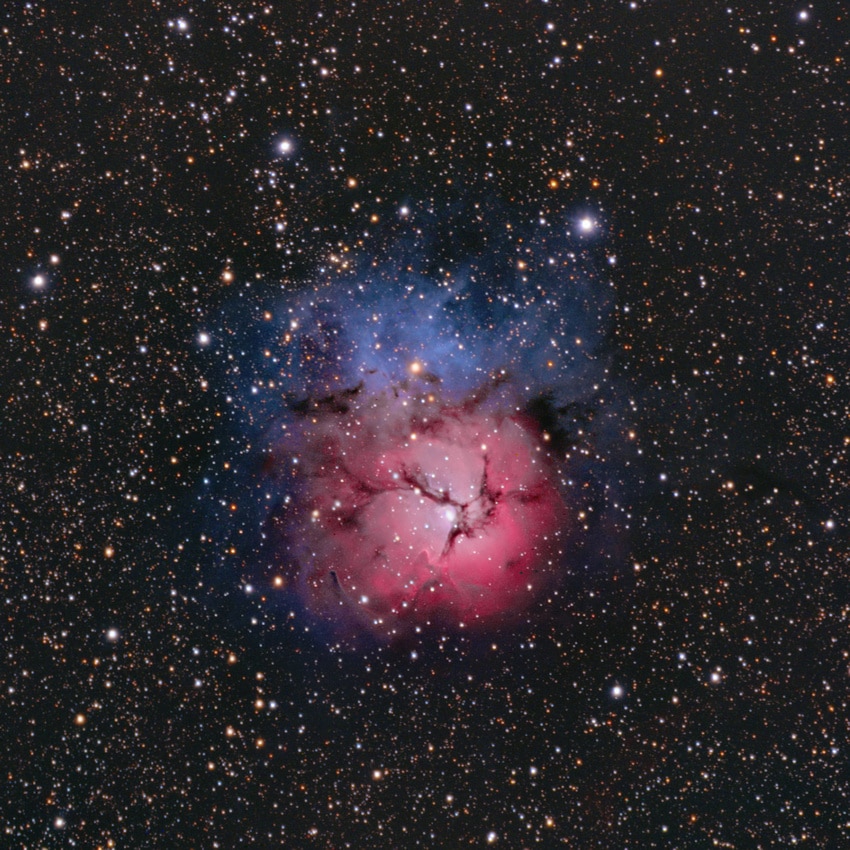 En esta imagen de infrarrojos de la Nebulosa Trífida, en el centro, puedes ver una enorme estrella de clase O6. Crédito: NASA