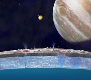 Concepto artístico del océano líquido de Europa, con Júpiter e Ío en la imagen.